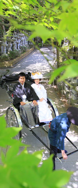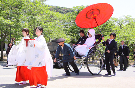 厳かな神社式のあとは人力車で「鹿島殿」へ移動という古式ゆかしい演出も人気。
