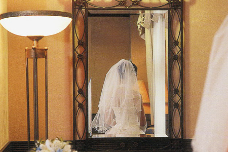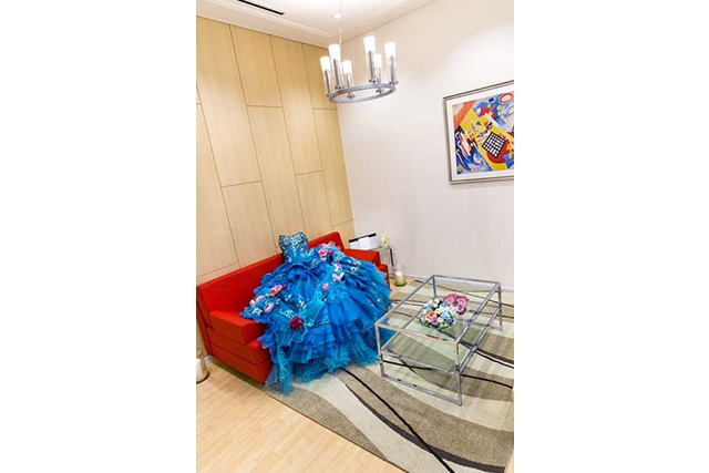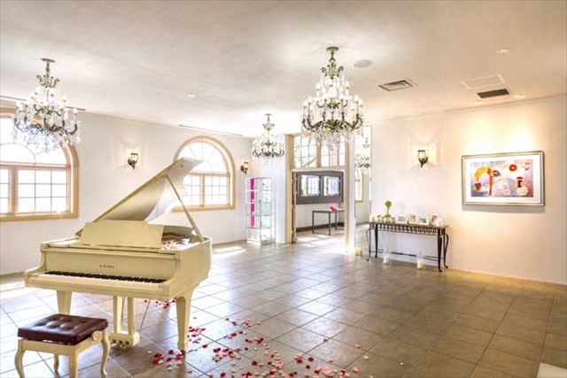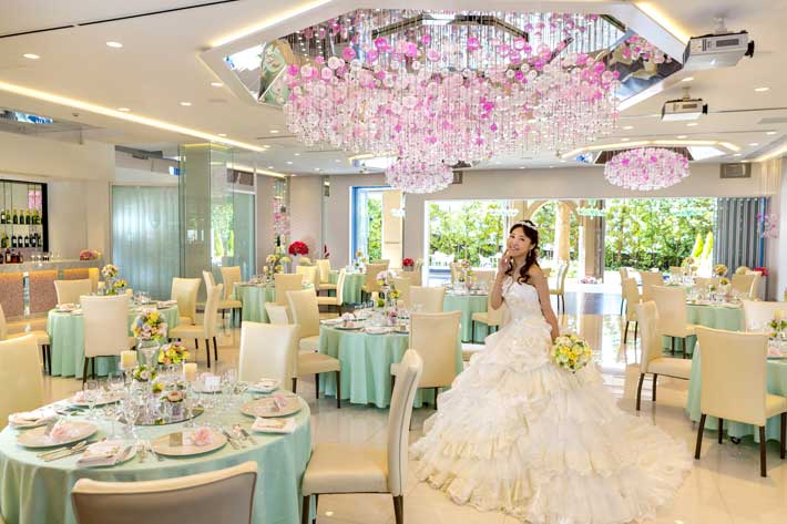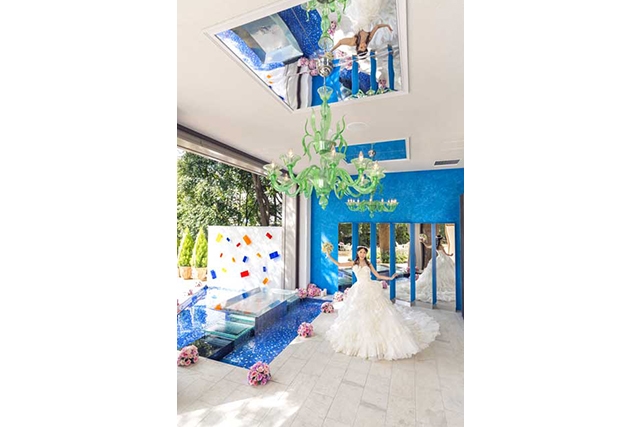 広々としたラグジュアリーなプライズルームもあり、ドレスチェンジのひとときもゆったりと過ごすことができる。テラスには緑のヴェネチアングラスのシャンデリアが煌き、華やいだ雰囲気を醸し出している。