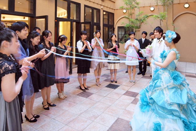 ふたりが歩むバージンロードは、「いつまでも幸せでいられるように」との願いがこめられた真っ赤なバラの花びらが敷き詰められ、鮮やかに挙式を彩る。