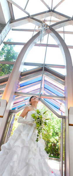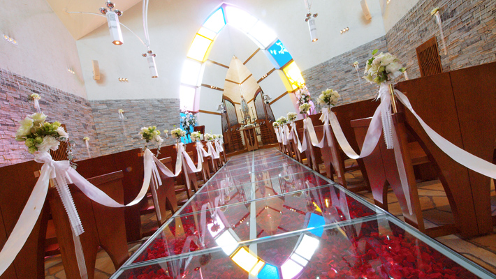 メインテーブルの上には「愛と希望」を表現したステンドグラスが、鮮やかな光を放っている。