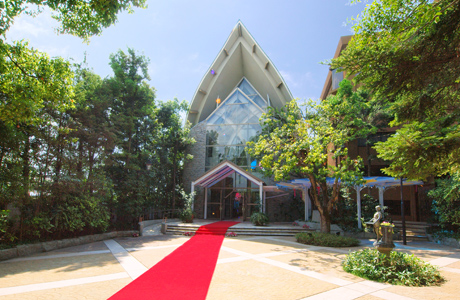 やわらかな自然光が降り注ぐ全面ガラス張りのエントランスが印象的なガーデンチャペル「リュミエール」は、天井高18mを誇る大空間。