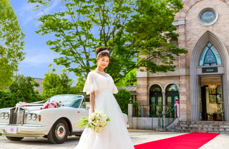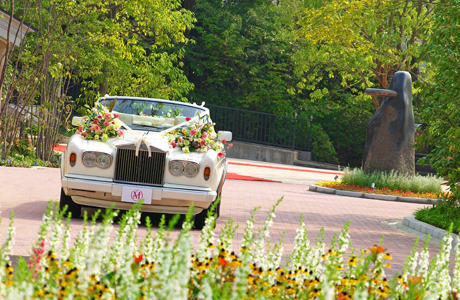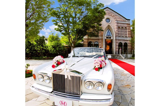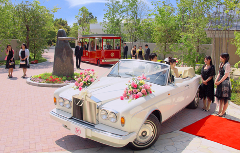 挙式当日、新郎新婦の二人は真っ白なロールスロイス コーニッシュⅡに乗って邸宅とチャペルを移動。
