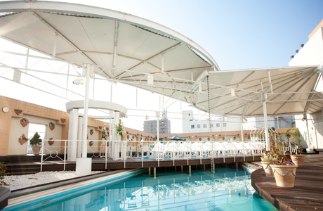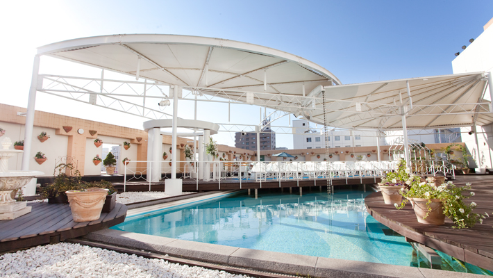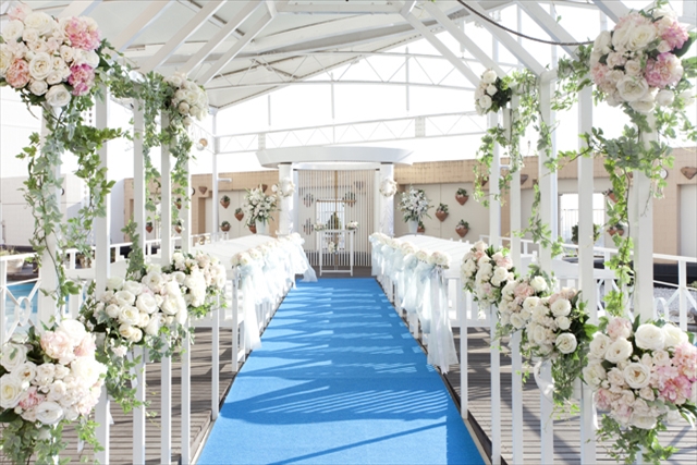 屋上プールサイドにウッドデッキと全天候型のドームを兼ね備えたこのチャペルは、開放感溢れる空間。