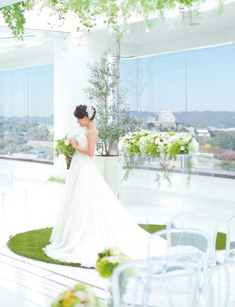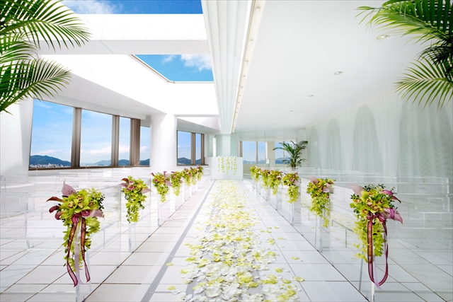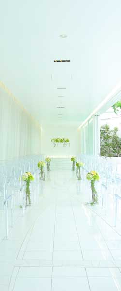 最上階にあるチャペルは片側一面に広がる美しい山並みと真っ白の空間、長いバージンロードが印象的。